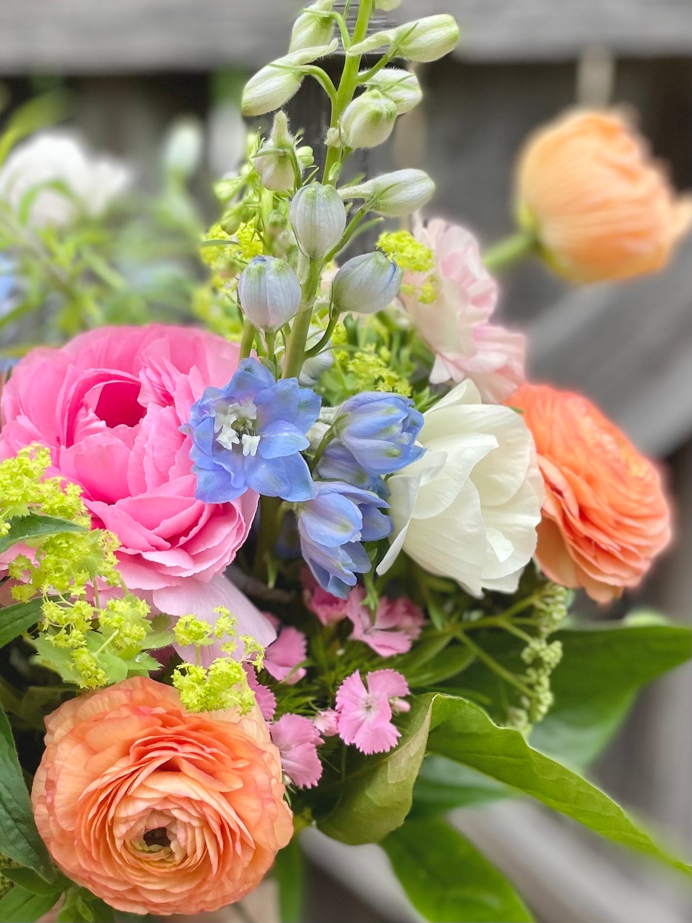 Between late May and early June, things in the garden really start heating up with lots of texture, color and fragrance bursting into life! Some of my favorite flowers this time of year include ruffly ranunculus, sweet smelling garden roses, and whimsical snapdragons. The flowers pictured represent what’s often blooming during this time, but every bouquet you receive will be unique!